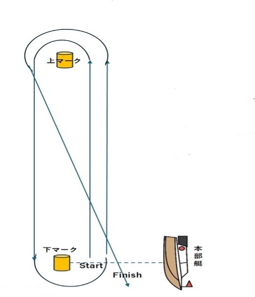 スタート → ① → ② → ① → フィニッシュとし、マークを左舷に見て回航(反時計廻り)する。下図を参照のこと。