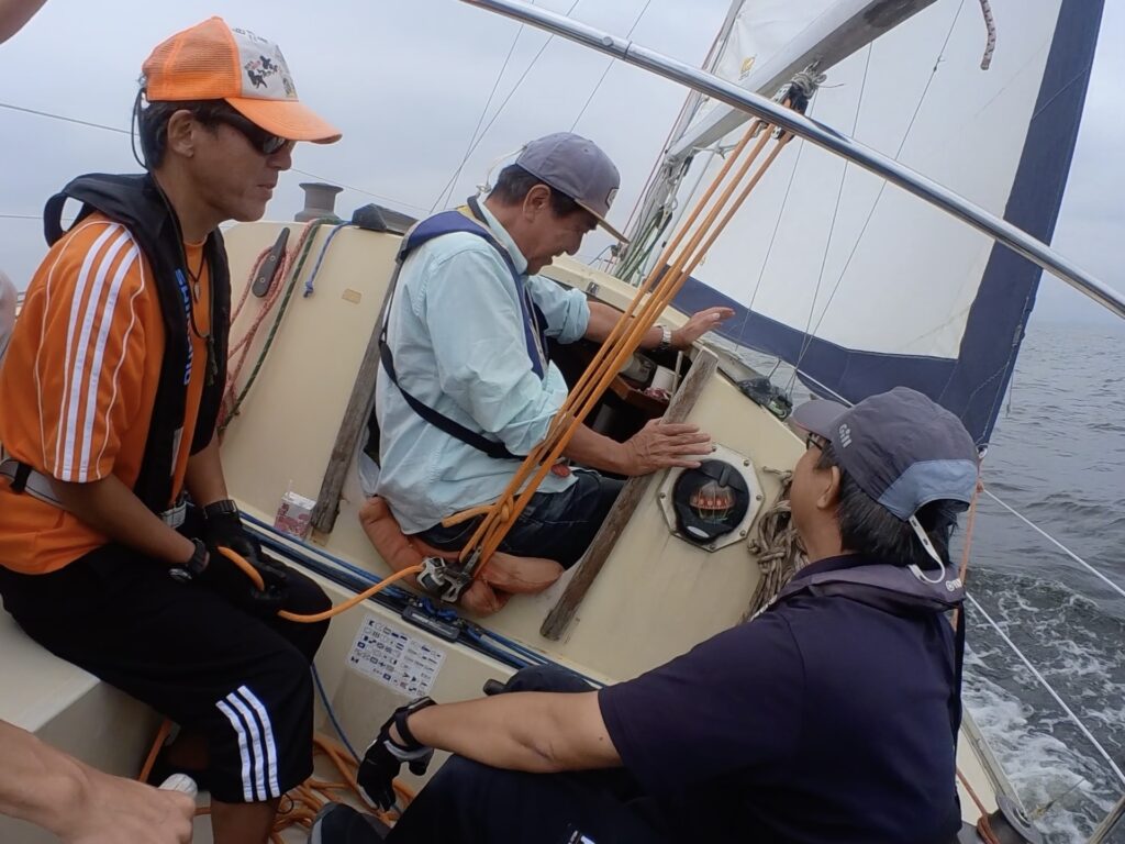ここは仲良く、ティラーとメインシートの息を合わせていきます。そえださんと、とのがいちさんのアドバイスのもと、くるくると回ることができました。チーム一丸となる楽しさ、ヨットが自由自在に操れる楽しさ。『楽しい。』と思わず声が出てしまいました。