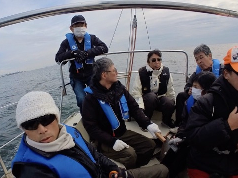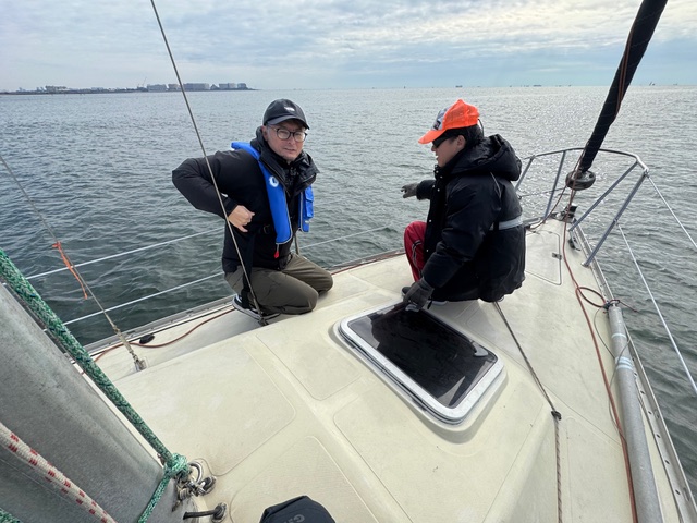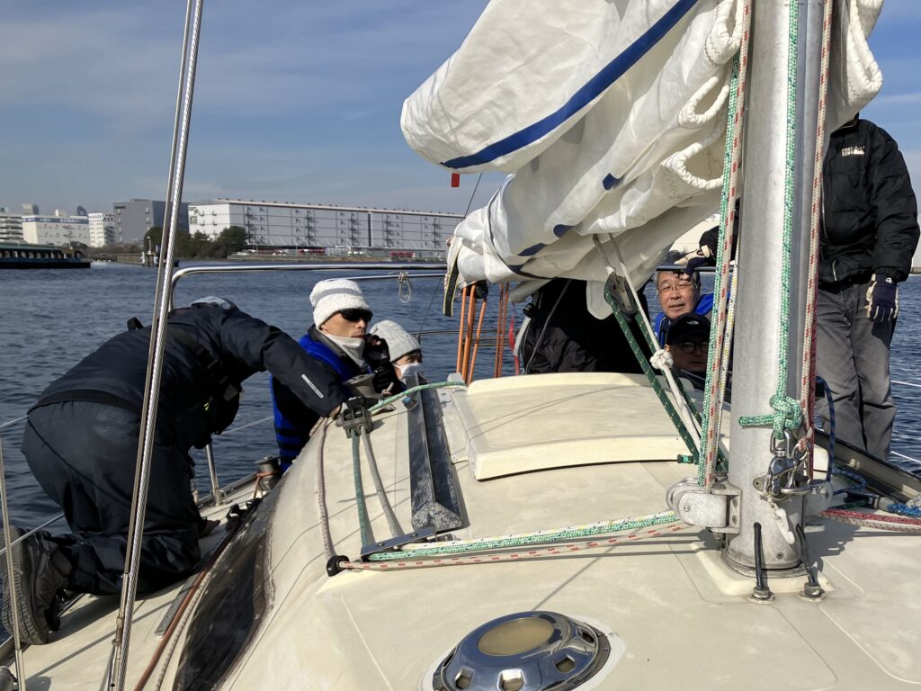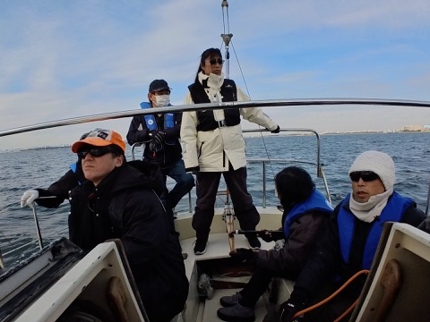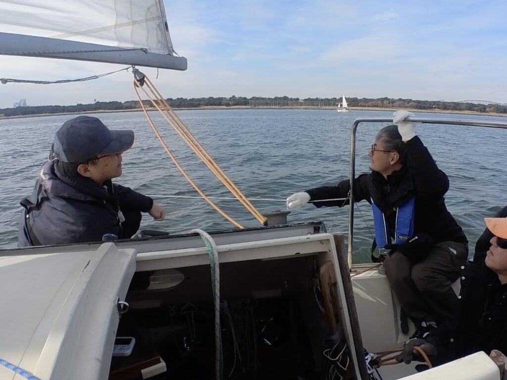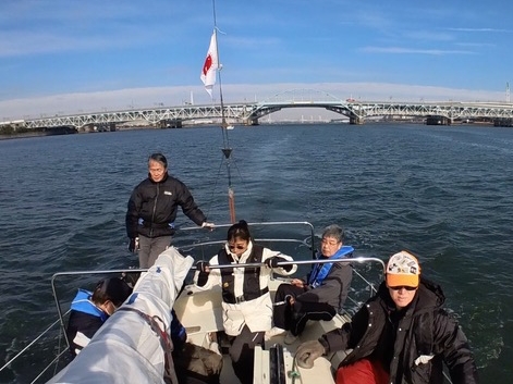 今回のセーリングでは会員8名に加え、体験者さん1名が参加してくれました。体験者さんはセーリング翌日にJBSAに入会していただけたので、簡単にご紹介させていただきます。お名前は大草さん。漫画こち亀で有名な亀有からお越しです。以前からマリンスポーツは大好きだそうです。当時からヨットには興味があり色々調べていたところ、ネットでJBSAのことをお知りになり、体験セーリングへお申し込みくださいました。夢の島には少々ご縁があり、体育館にはよく来られているそうですが、夢の島にマリーナがあるとは知らなかったそうです。