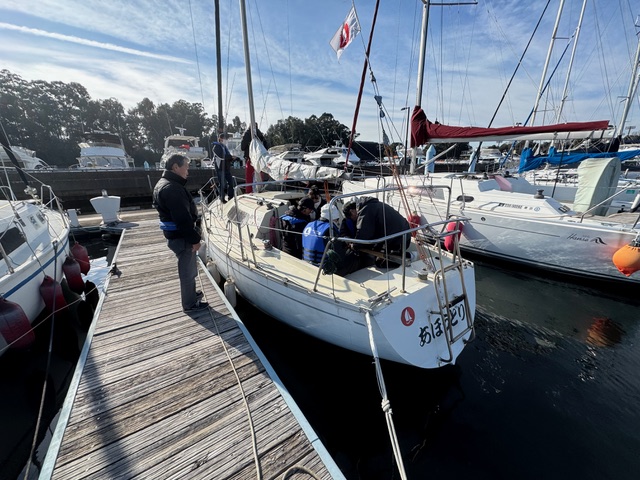 マリーナに近づくとフェンダーをライフラインにくくり付ける作業を手伝わせてもらいました。前回教えていただき、自宅で古くなったLANケーブルを使って練習したクラブヒッチを試す場面です。これでいいのかなと不安に思いながらも作業をさせてもらいました。もしかするとどなたか後で手直ししてくれたのかもしれませんね。さらにポンツーンに到着後、係留作業も手伝わせてもらいました。これまた前回教わり自宅で練習してきたクリートヒッチの出番です。横で見ていただきながら作業をしたのですが、あほうどりが漂流していないか今でもドキドキです。