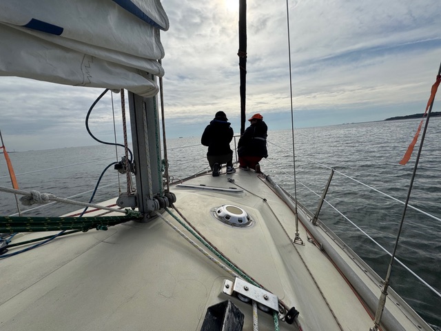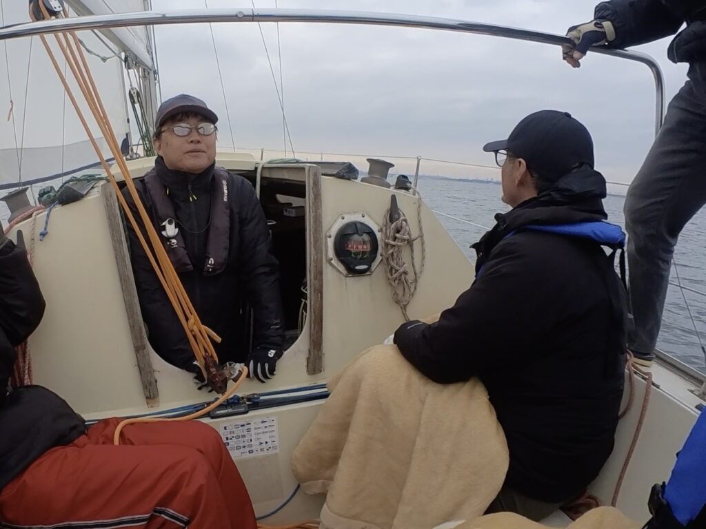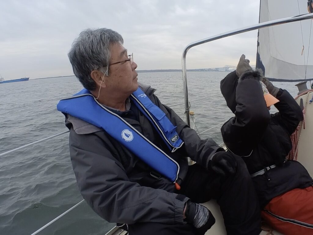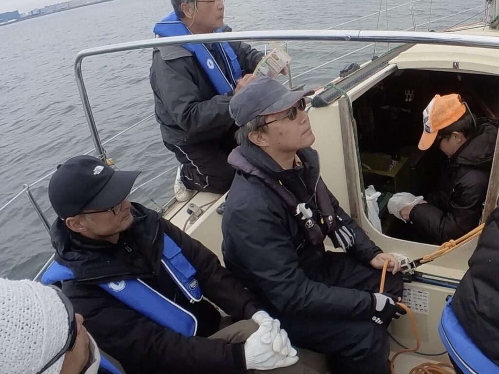 この日の天気は午前中は予報と違い太陽も出て良い天気でしたが、午後からは曇り、そして帰るころには小雨が降ってきました。太陽がかげると寒い寒い。キャビンから毛布をだして膝にかけるほどでした。そんな中でもよい風が吹いているのでセーリング練習。タックを繰り返してティラーとシートの動きを合わせる確認など。もしかすると私がティラーを握っているときにあらぬ方向へ向いてしまったせいか、思いのほかマリーナから離れてしまい、帰りの機帆走が長めとなりました。
