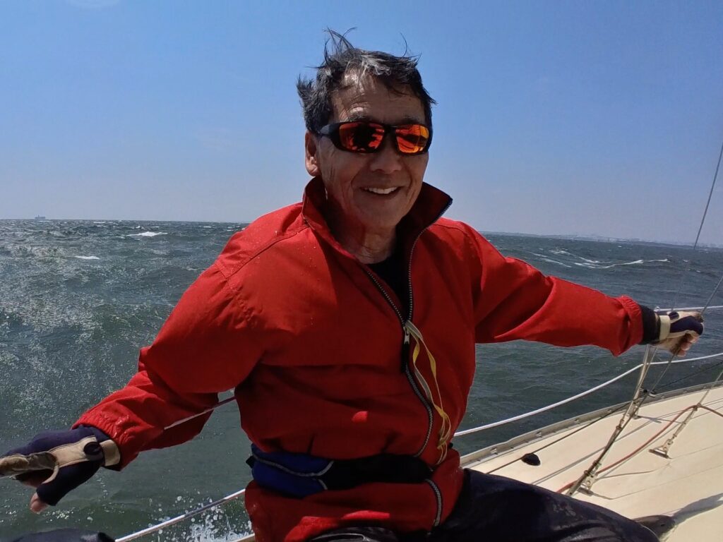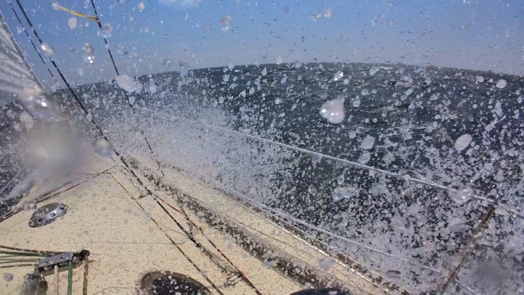 珍しく、東京湾、は、波もうねって高さ1メートル位。当然、スプレーが横から飛び込んできます。スプラッシュマウンテン5倍のスプレー、ものすごいわけです。さらに風速8メートル。船はヒールしながら進みます。副田さんの指示で、ミジップに人型ウェイトを置くことになりました。とのがいちさんを先頭にミジップの右舷ギリギリに向かいます。私は、とのがいちさんを盾に、後ろに隠れました。しかしスプレーは容赦なく襲ってきます。大きな波でバウンド。ドカン、パシャンと繰り返しです。。全身ずぶ濡れでした。