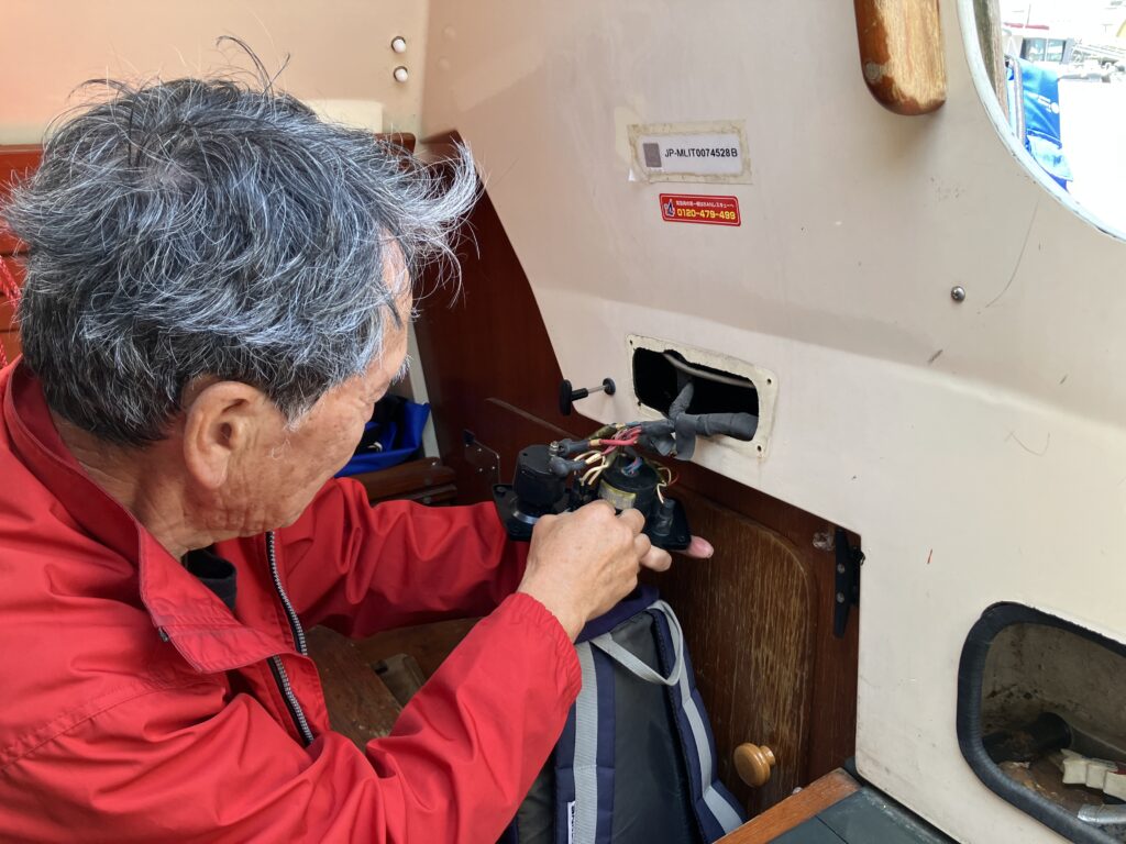 機走のまま、とのがいちさんにティラーバトンタッチ。OB杭の先を目指しますが、30分以上経過してもなかなかポイントに、たどり着きません。向かい風、機走でも辛いものです。