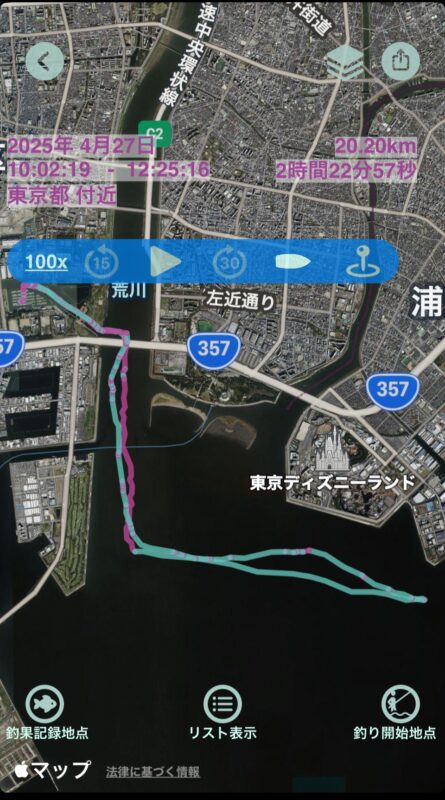 時刻は11時20分。ディズニーランド沖まで来ましたが、この先、強風波浪の見通し。折り返すことにしました。