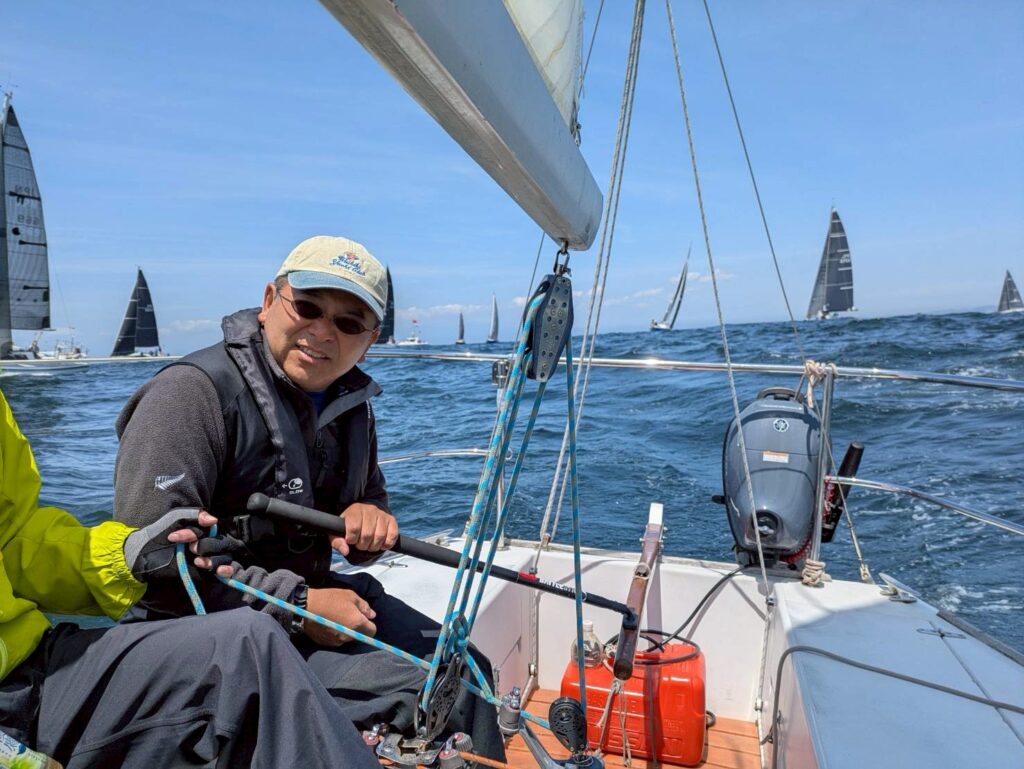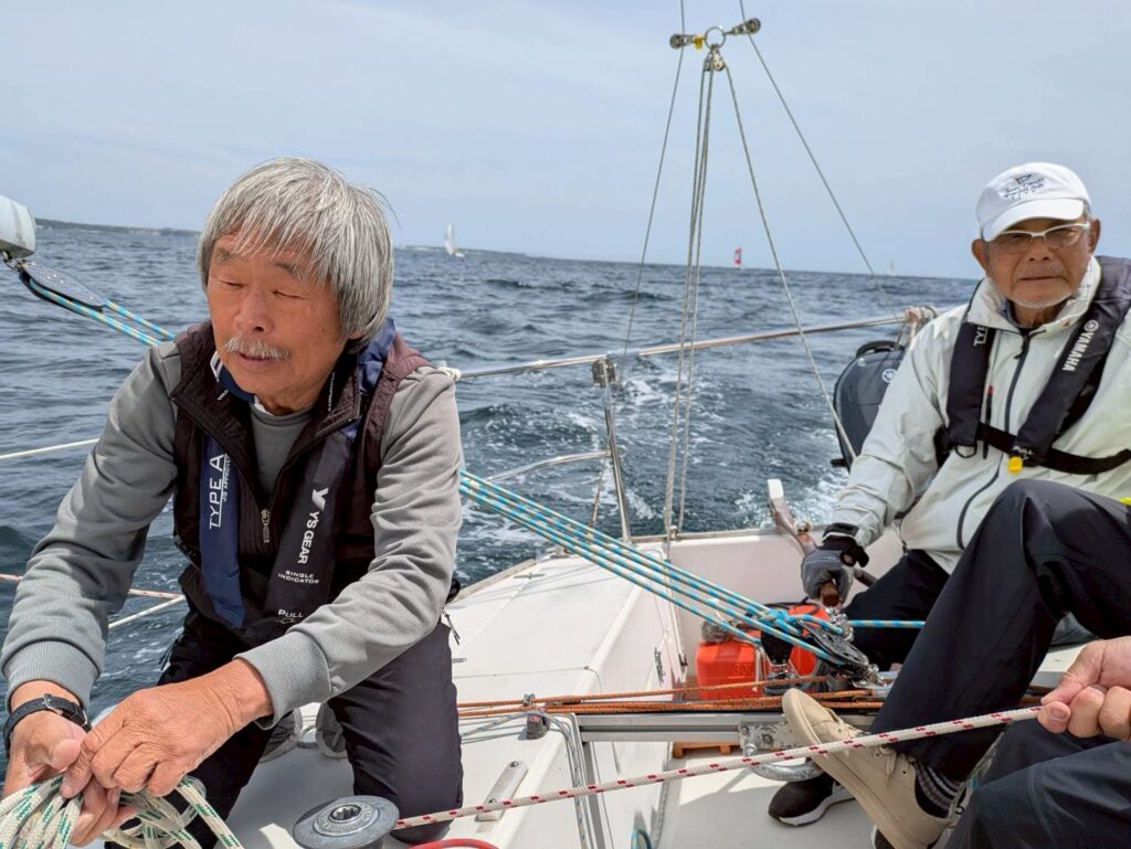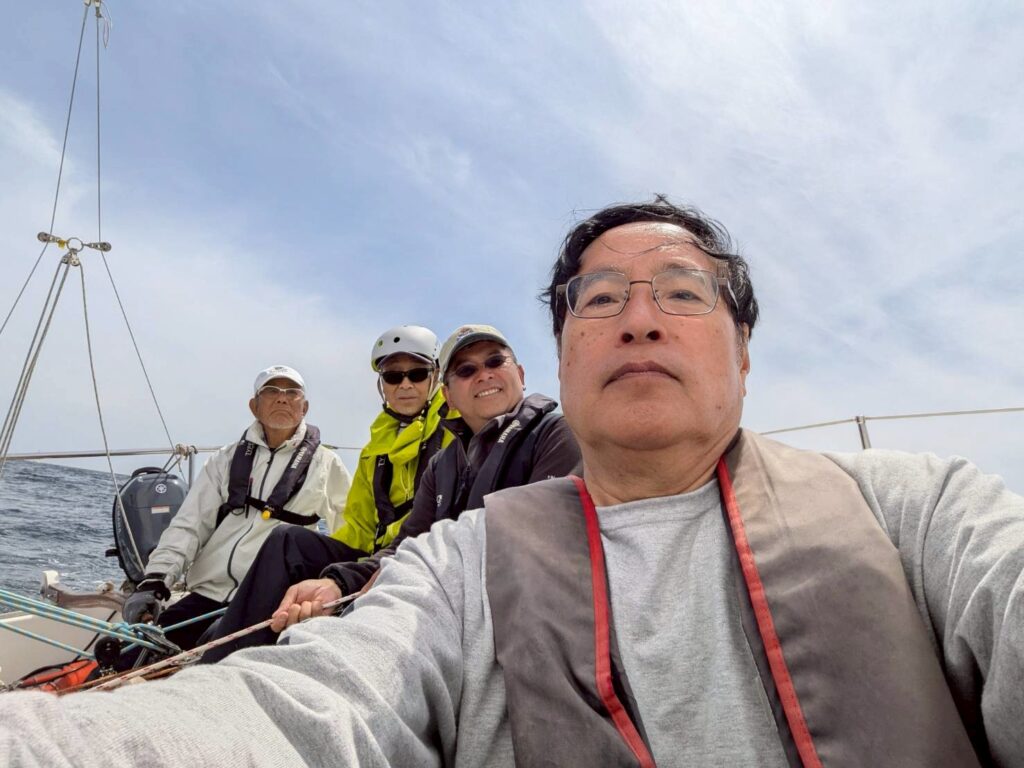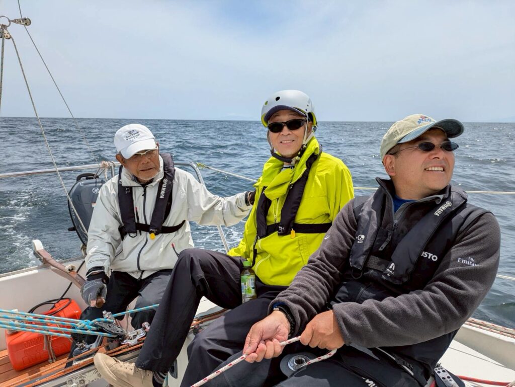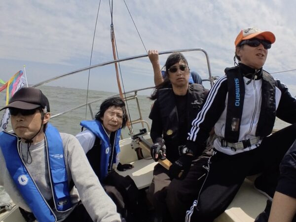 メインシートの私は各艇がひしめく中 ついていくのが精一杯でした。南下するに従いマーク付近では風とウネリが強い状態でした。北上すると風波が弱くなり、ゴール近くではほとんど無風状態となり全員がヤキモキしました。風とウネリの変化が激しい一日でした。緊張感の連続と充実感の満ちた一日でした。