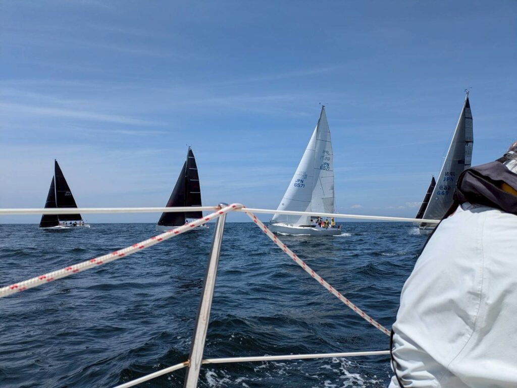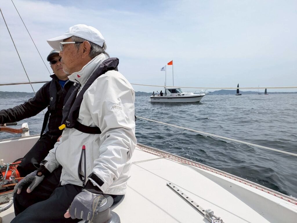 風速は6~9m、スタートは本部船側にレース艇が集中してゼネリコが2回繰り返され、3回目で成立。ヘルムスの福島さんの巧みなさばきとチームプレーで良い位置からスタートした。