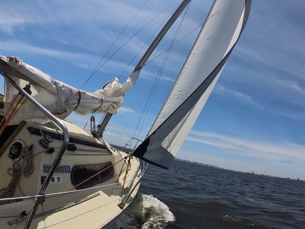それでも30度ぐらいはヒールするシーンもあり、最高速度は6.8ノット。風がヒューヒューと音をたてはじめているぐらいの風速で、32度の気温があるはずだが涼しく心地よい。