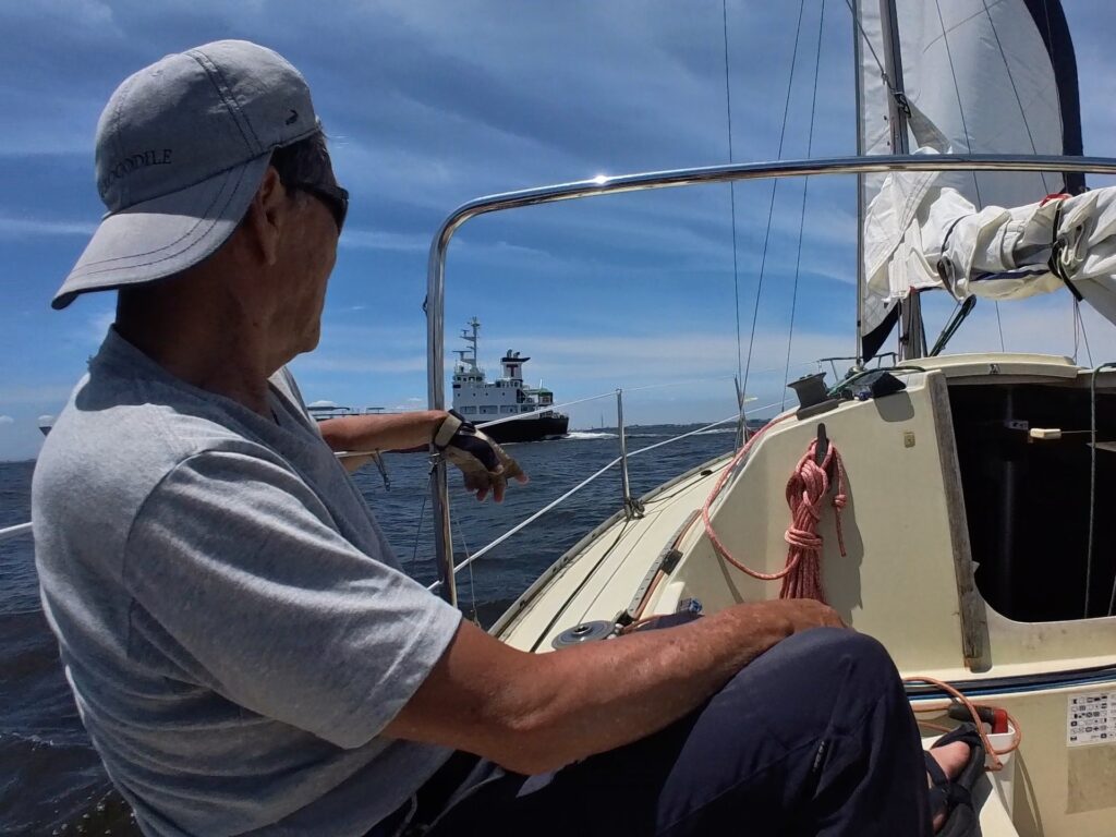 「強気だなあ。よける気ないな」と玉木さん。恐ろしいことに、ティラーをもっているのは私だったのだが、強気の本船と戦ってもおそらく勝てないので、古庄さんのガイドでスタボー側へ少しのぼってよける。