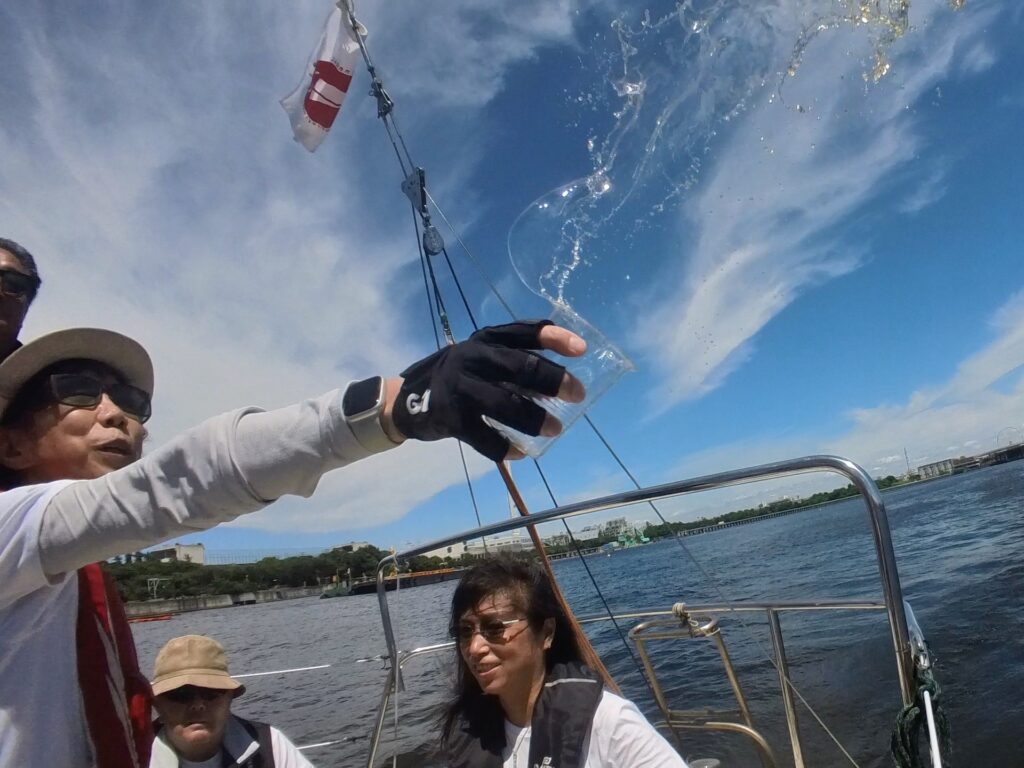 小倉さんが、「ゲタさーん!献杯!ひゅー!」といって、I.W.ハーパーを左舷の外側へコックピットから海へむかってまいた瞬間、すべてのお酒が風で戻ってきて、小倉さんと、やげたさんの遺影がびしょびしょになり、みんな、今度は心から笑った。