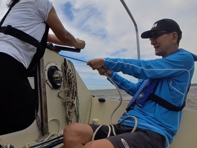 水田さんには、艇のヒールなどの挙動が、ティラーのブレや風が変わったからなのではなく、変わった風に対して、メインで調整しているためであることを伝えるため、メインならとリムインといって引き込み、イーズといって出し、トラベラーならアップとダウンで伝えながら、真っ直ぐ最速で走る練習。