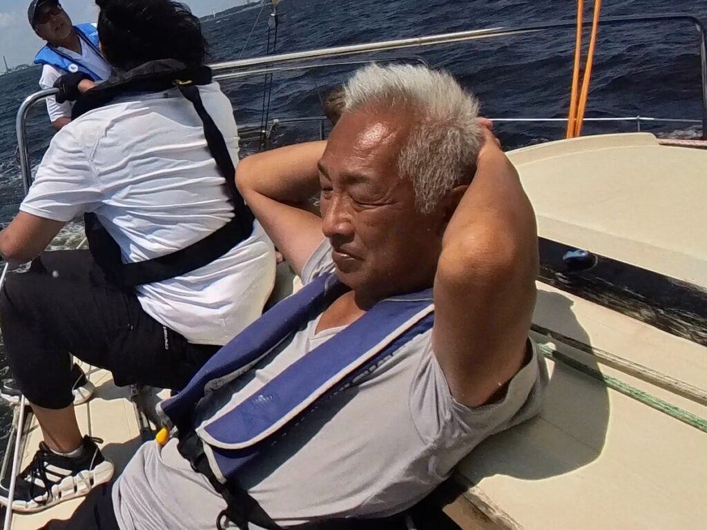 いつものように機走から帆走に切り替え、最初にティラーを握らせていただきました。ティラーがこんなに重いのは初体験。体重をかけないともっていかれそうでした。ウェザートリムは何度も経験していましたが、ブローがきたときにあれほど進路が変わるとは。いままでのはだいぶ生易しかった模様です。それに時々来る大き目の波に乗り上げたときにもティラーに思いっきり抵抗がかかり、進路ももっていかれるのがわかります。今回の体験はとても勉強になりましたし、貴重な経験でした。ティラーを交代したあと、しばらくしたら気分が悪くなってきました。生まれてこの方乗り物酔いにはなったことがないのですが、船酔い初体験です。自分では「軽い熱中症で気持ち悪いだけだ」と信じたかったのですが、乗り物酔いなんて認めたくないと思っていましたが、ケロっと回復したのを見て、クルーの皆さんは「船酔いに間違いない」とのことでした。酒には酔うが乗り物には酔わないと思っていたのですが・・・。年齢のせいですかね。いや、これも経験を積めば大丈夫だと自分に言い聞かせています。
