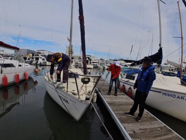 フィニッシュ後も強風が続く中、ジブ・メインセールともに降ろし、無事帰港。