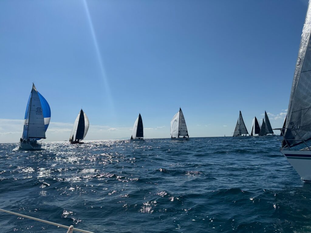 レースはアビームで進行。マーク付近で風が落ち、ギリギリで回航。