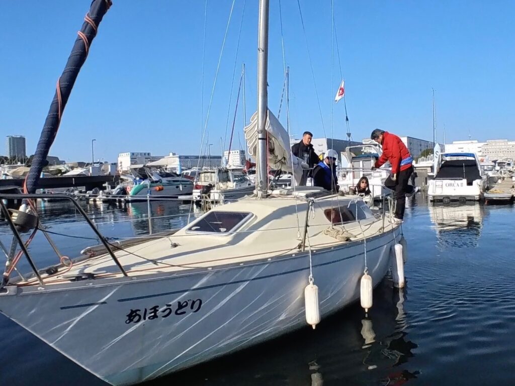 右舷側には水田さんに隣の船にぶつかりそうになった場合におさえてもらう役割を、スタンもやいはそえださん、バウもやいは私がもって着艇。玉木さんの見事なハンドリングとアクセルワークにより、もはやうまく動かないあほうどりを、桟橋ぎりぎりまでよせてもらい、あとはちょっとポンツーンまでジャンプが必要でしたが安全な範囲だったのでこれでキープ。