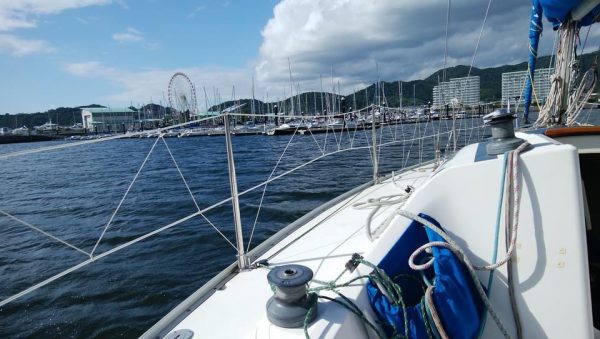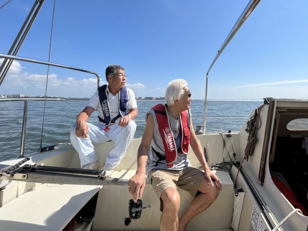 前半は橋本さんがヘルムスパーソンをつとめ、後半はそえださんが担当。メインは小柴さんから私に変わったものの、今回は練習はせず、久しぶりのヨットをのんびり楽しもうということだったので、トラベラーは中央付近で、メインシートもほとんどロックしたままだった。