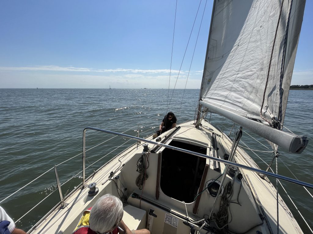 当初、無風を覚悟し、実際1メートルぐらいの風に耐えきれず、エンジンをかけて風を探すことになったが、途中からは5メートルほどの風に、6ノット程度で気持ちのいいセーリングをすることができた。