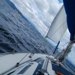 3か月ぶりの活動であり、艇の状態を確かめながら、基本セイリングを行いました。風が少し強かったため、ジブセイルは3分の1ほどで走ることにしました。最初はクローズで南にの方の姫島に向かいました。その後北西に向かい大島から形原漁港辺りを巡りました。途中で艇は走らせたままそれぞれが持ち寄った物を食べながら、長いランチタイムを楽しみました。そして2時間半ほどで、マリーナに戻ってきました。久々に爽やかなセイリングができ、コロナ禍の閉塞感から解放された気分になりました。