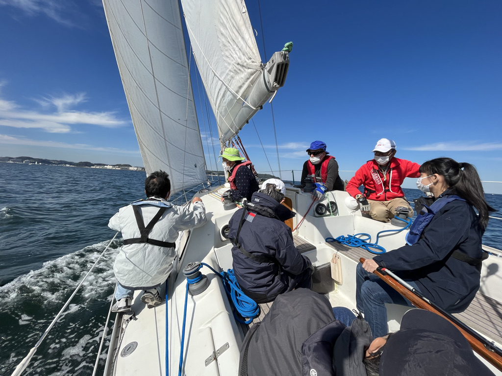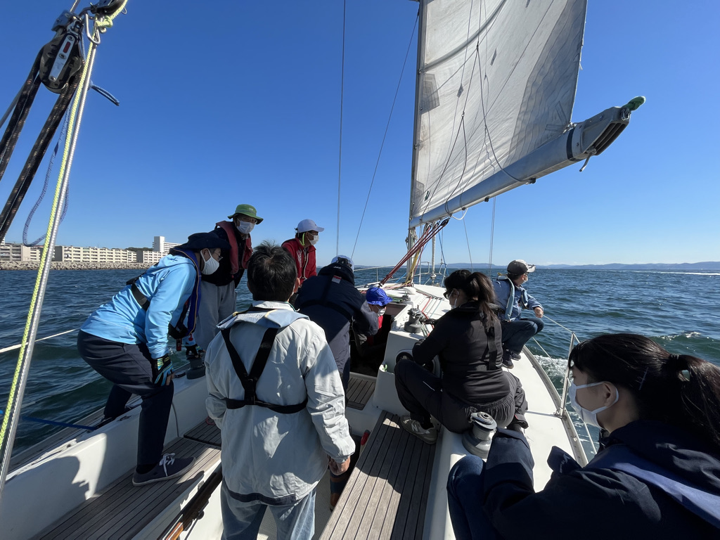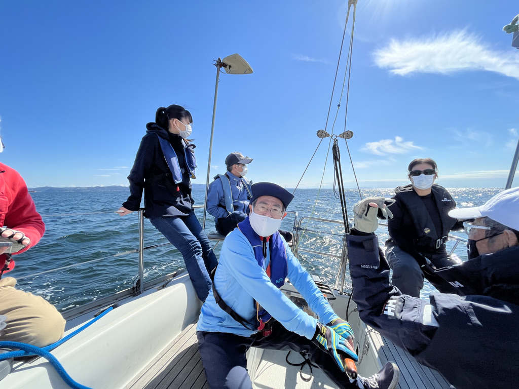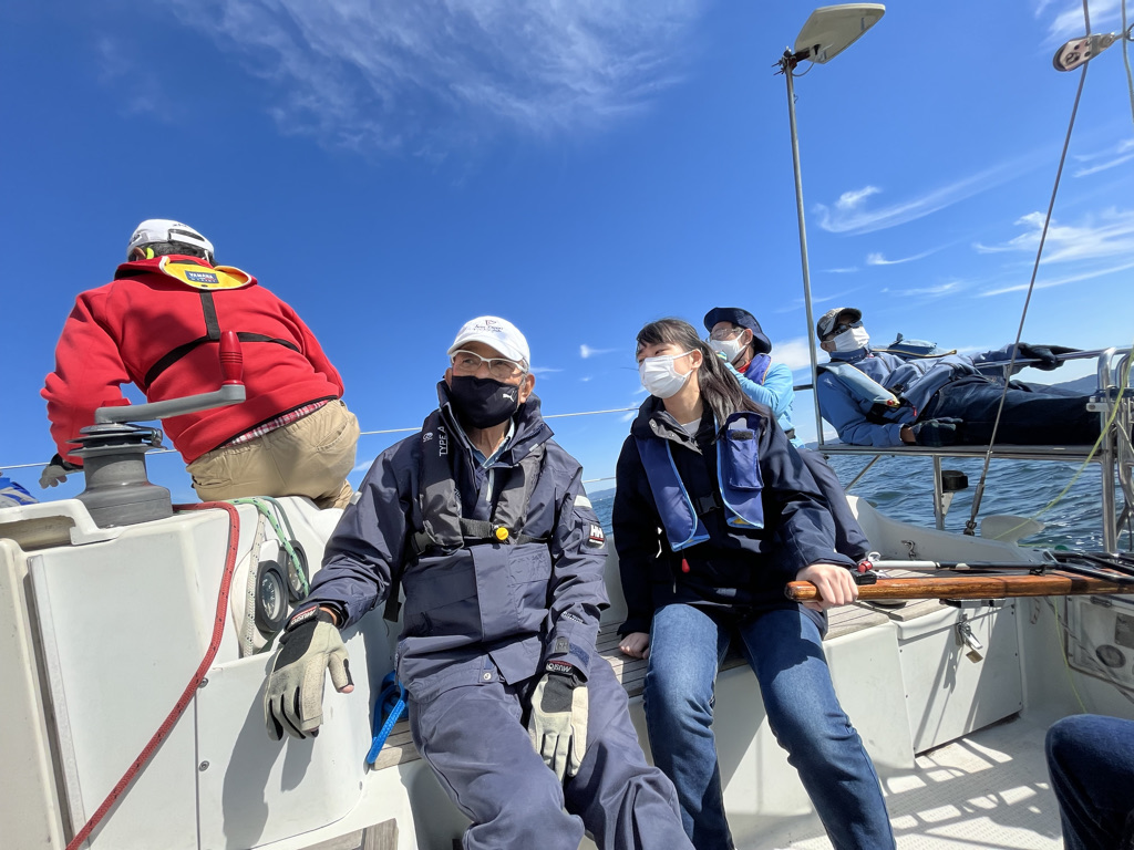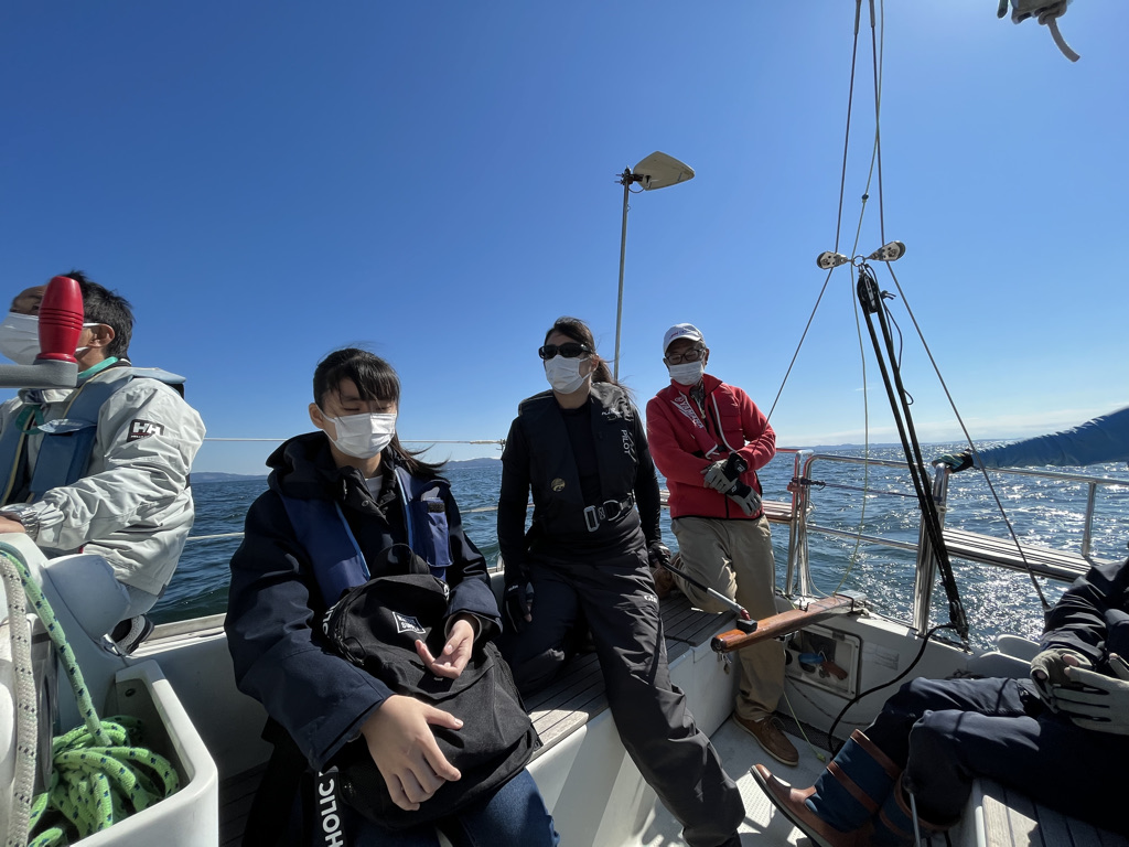 出港時と帰港時は、大賀さんがヘルムスとして操船してくださり、その他は、副田さん、殿垣内、林さん、友香がティラーの練習をさせていただきました。