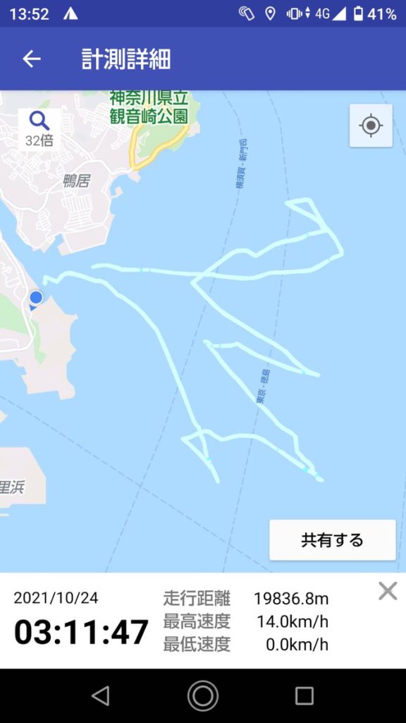 出港時より荒木さんが、京セラのアウトドア向けスマホ「トルク」でのみ利用できる、セーリング用のトレーニングアプリ「Sailor’s Log」で記録を取りながら、天候や速度、まっすぐ走っているか、タックは綺麗にできているかなどを、伝えてくださっていました。アプリの紹介ページはこちら。