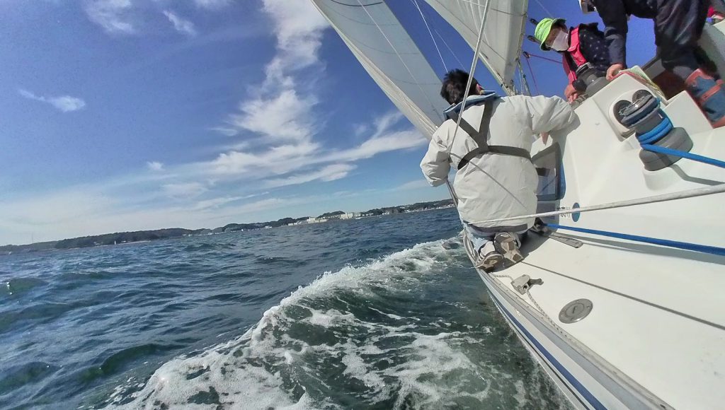 しかし、この初心者4人が、皆さんからしたら稚拙な走りをしている間も、野村さん、大賀さん、荒木さんは決してその走りを放置せず、メインやジブのシートだけでなく、カニンガム、ブームバング、アウトホール、トラベラー、バックステイ、ジブカーの位置など、非常に頻繁に調整し続けてくださり、私は感動しました。