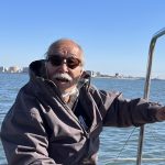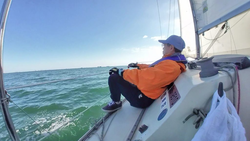 私は今回、終始メイントリマーをつとめていた。面白かったのは、8名も乗っていたのに、タック時にジブにつく人がいなかったため、しめしめと、そこから私がメインシートとジブシートの2本を持ってトリム。