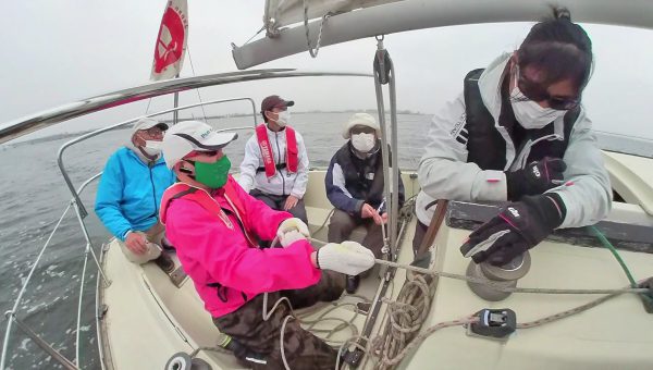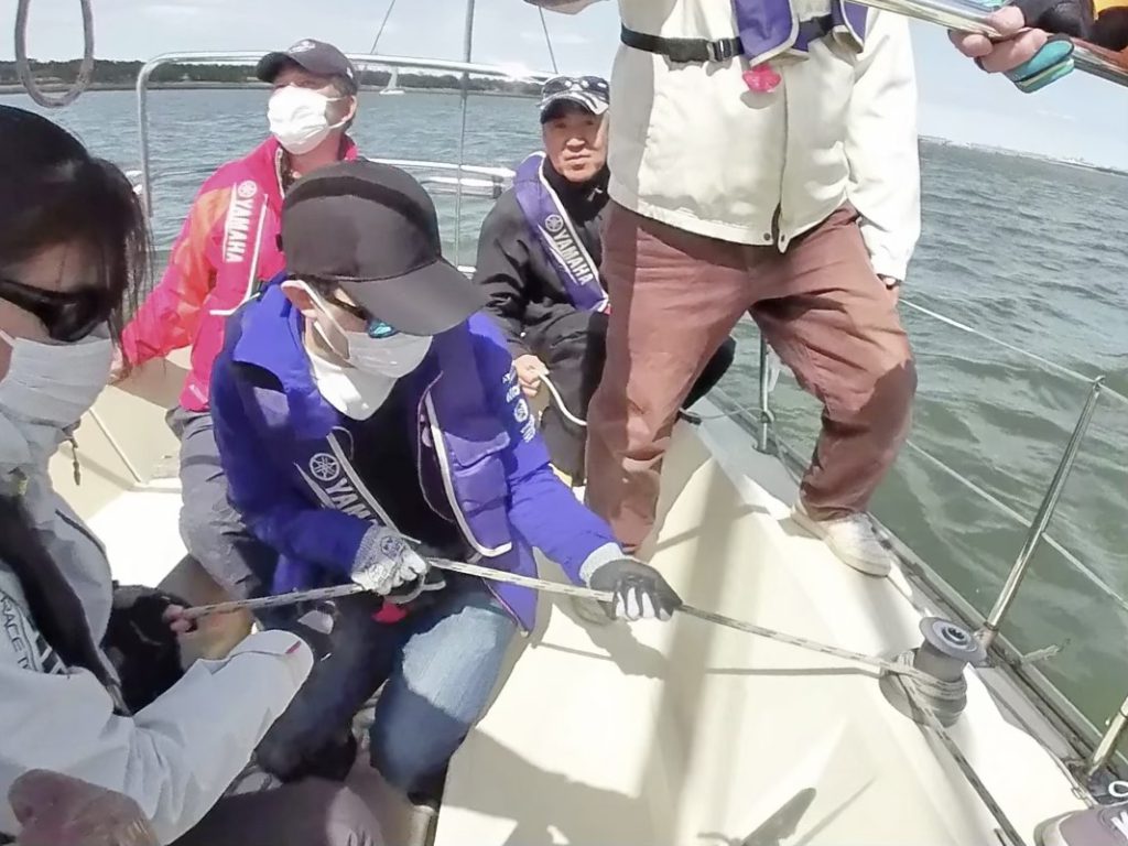 一生懸命メインハリヤードを引いていた私にはわからなかったのですが、走りながらメインセールを上げるという技を、村上さんが伝授してくださいました。「掛け声をかけたら引いてね!」と言われ、みんながタイミングを合わせて一気に引き、無事に上げることができました。