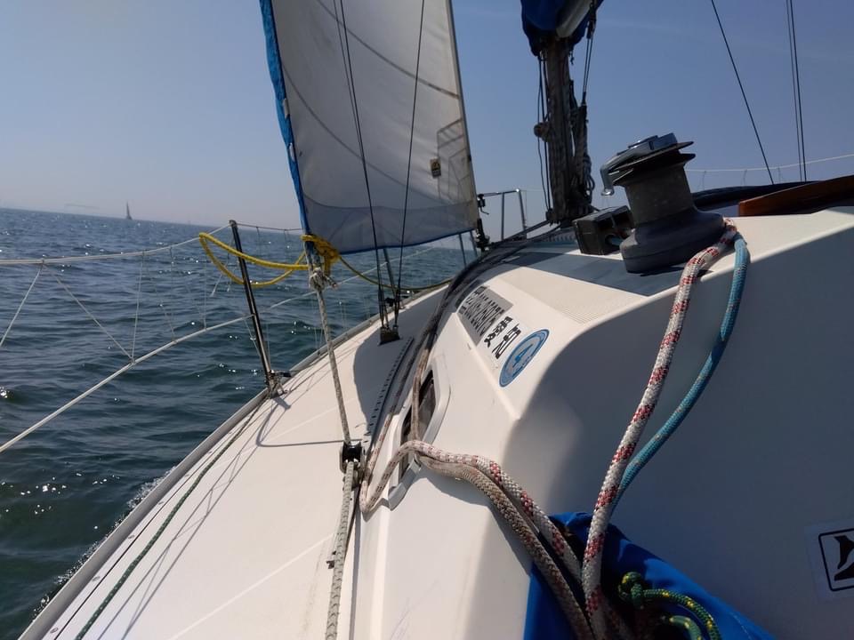 西風が安定していたので、クローズで、渥美半島にある姫島の方を目指しました。基本ヘルムは明日香ちゃんが担当しました。最初はティラーが重たいと言っていましたが、トラベラーを落として、バックステイを引くことで、随分と快適な操船になったようです。3月には山田さんが艇のメンテナンスを細部にまでしてくださっており、とても滑りが良く、安定して、5ノット程で、走っていました。