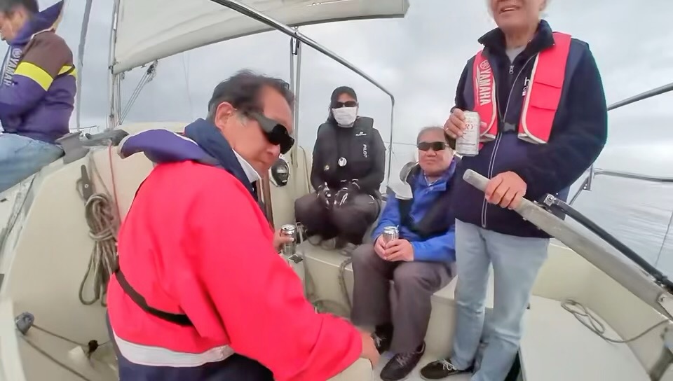 風もなく、小雨の中を漂いながら、伊藤さんが持ってきてくださった、八つの海と山という飲み物を、雨が入らないようカップを手で覆いながらいただく。