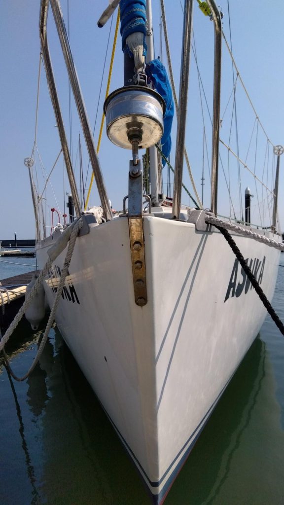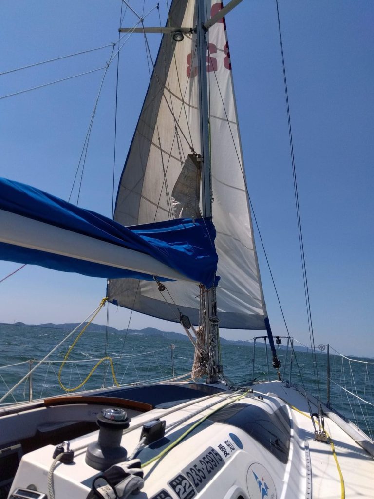ジブファーラを半分ぐらい開き、機帆走するが「うねり」でスプレーをあびる。