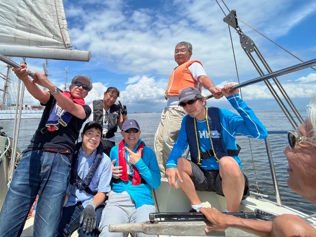若洲沖とディズニーランド沖の間ぐらいに、日本丸がいたので、みなで集合写真を撮る。