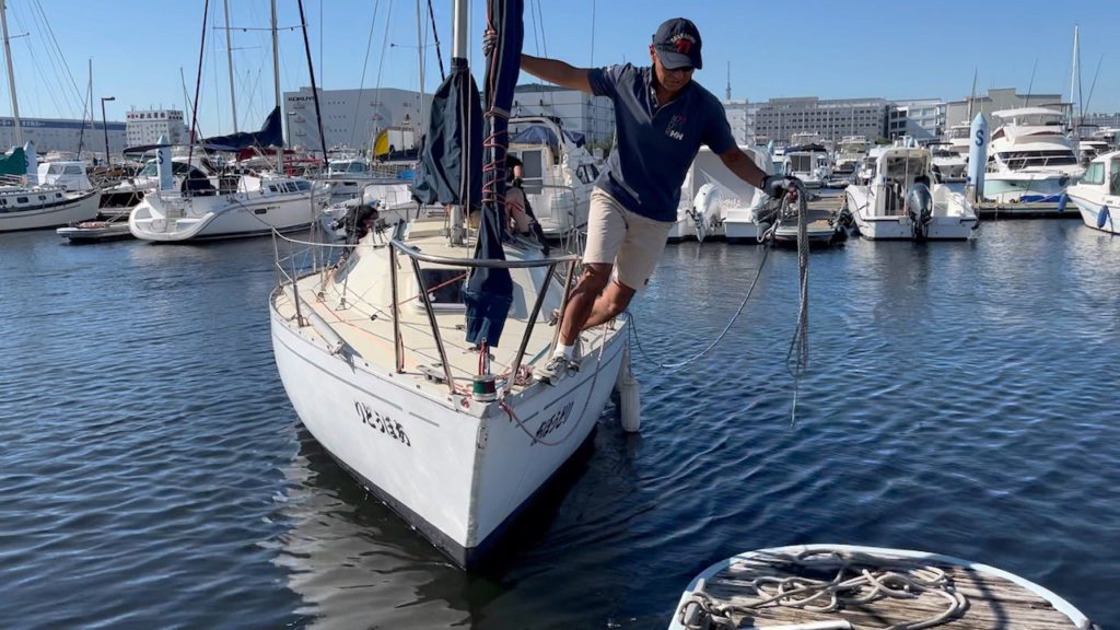 5.そえださんがティラー、私がバウとスタンのもやいをヨット側にあらかじめクリートしておいて、ポンツーンに飛び降りて係留する練習を、船を係留したまま行いました。その後は、実際に離岸させて繰り返し練習をしました。