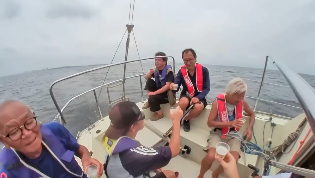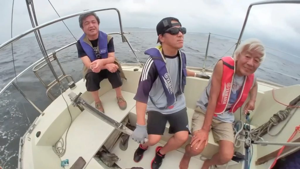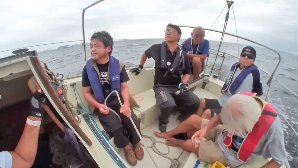 風がないとの予報だったが、そんなことはなく、いい感じで帆走。村井さんや佐藤さんもティラーを握る。佐藤さんの時は、アビームで走るときが多ような気がする。もっとたくさんティラーを握っていただき、いろいろな角度の風を感じていただきたい。今回は、毎回ティラーをことわっている、とのがいちさんが、なんと志願!。村井さんがメイントリマーで、ブラインドセーリングを楽しむことができた。