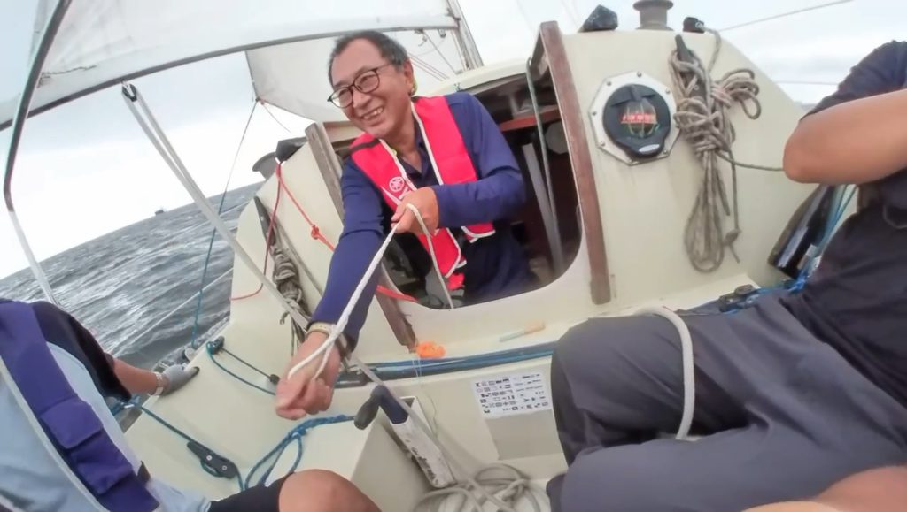 メインハリヤードは佐藤さんに引いてもらった。ウィンチも使って、体験の時よりも力強く引くことができていたよう。「ウィンチを巻きつつ、シートを引くと言うタイミングが難しい。」とおっしゃっていた。終わったあとも、熱心に復習していらっしゃいました。