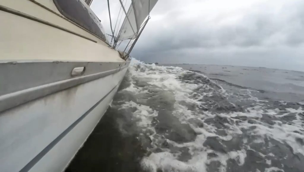 何回かタックをし、帰路に着く。佐藤さんにフェンダーをつけていただいたのだが、バウに来るのは初めてだそう。バウのクリート方法を説明し、リーダーやクリートを触って確認してもらい、ポンツーンについてから、スプリングなどを実際にクリートしてもらった。