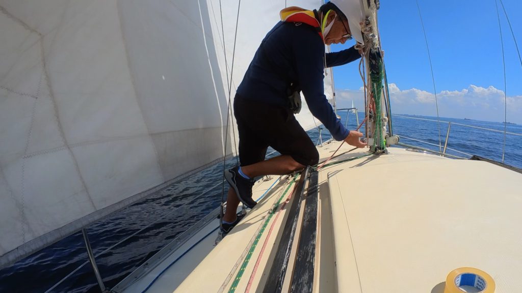 今回は台風対策で、ジブセールを外して終了。ジブセールの幅を初めて触って確認することができてよかったです。