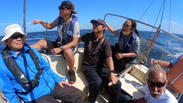 そこで今回は操船の感覚を取り戻すことを目的に、山田さんと森崎がティラーとメインシートを交代しながら、ずっと走らせました。穏やかな秋空の下(まだ少し陽ざしがつよかったですが)、アンカリングすることもなく、それぞれに持ち寄った物をシェアしながらのランチタイム。時にはシーホッパーの練習レースを観戦しながらと。久々のメンバーとの再会、のんびりとセイリングを存分に楽しみました。