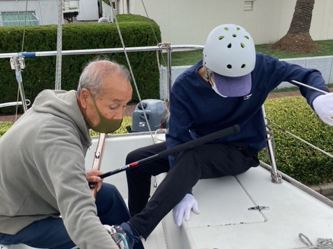 そのご、架台の上のルミナスに移った。メインセールの艤装、ロープワークやチラー操作時の体の動かし方ををじかんをかけておこなった。
