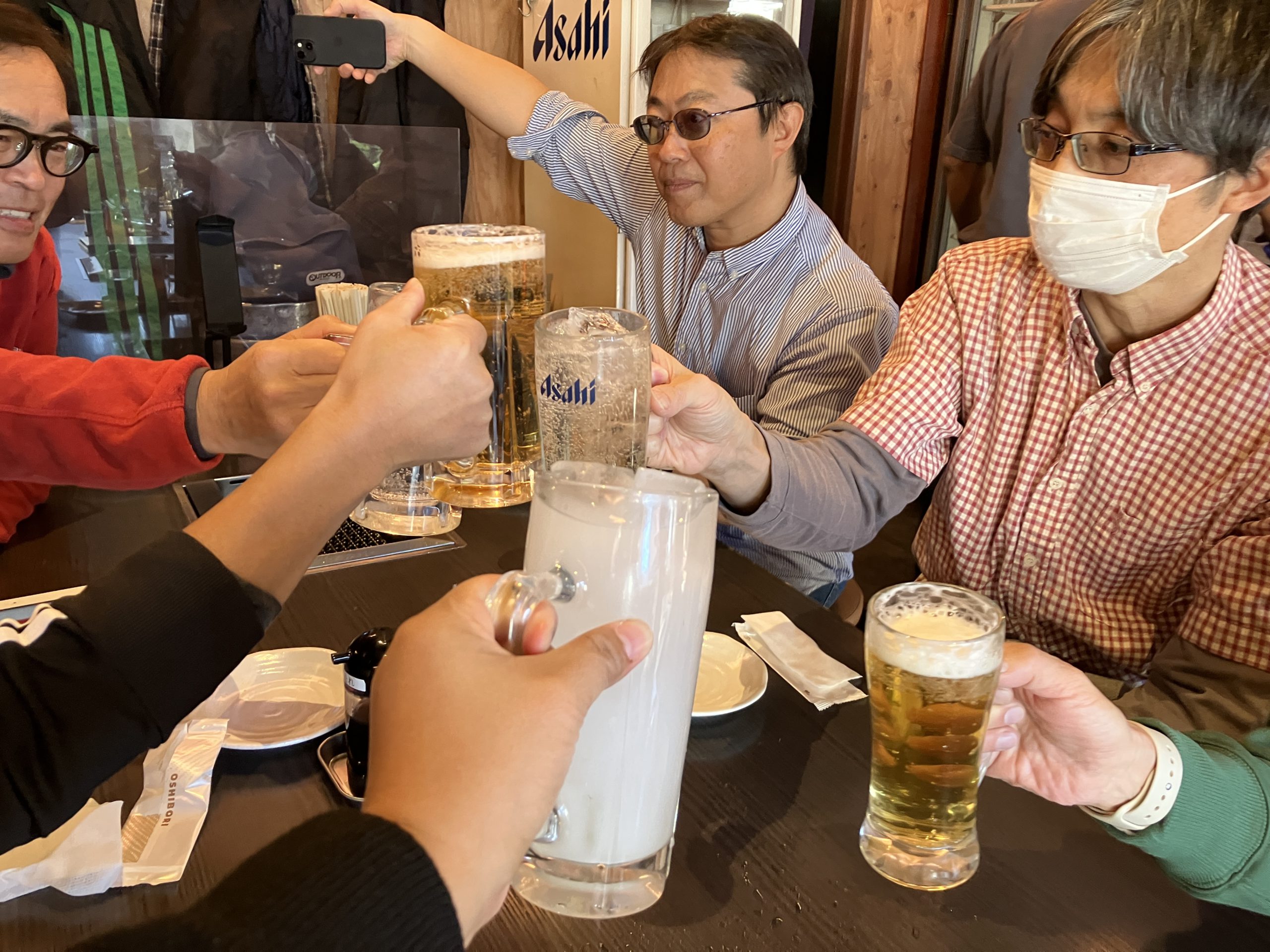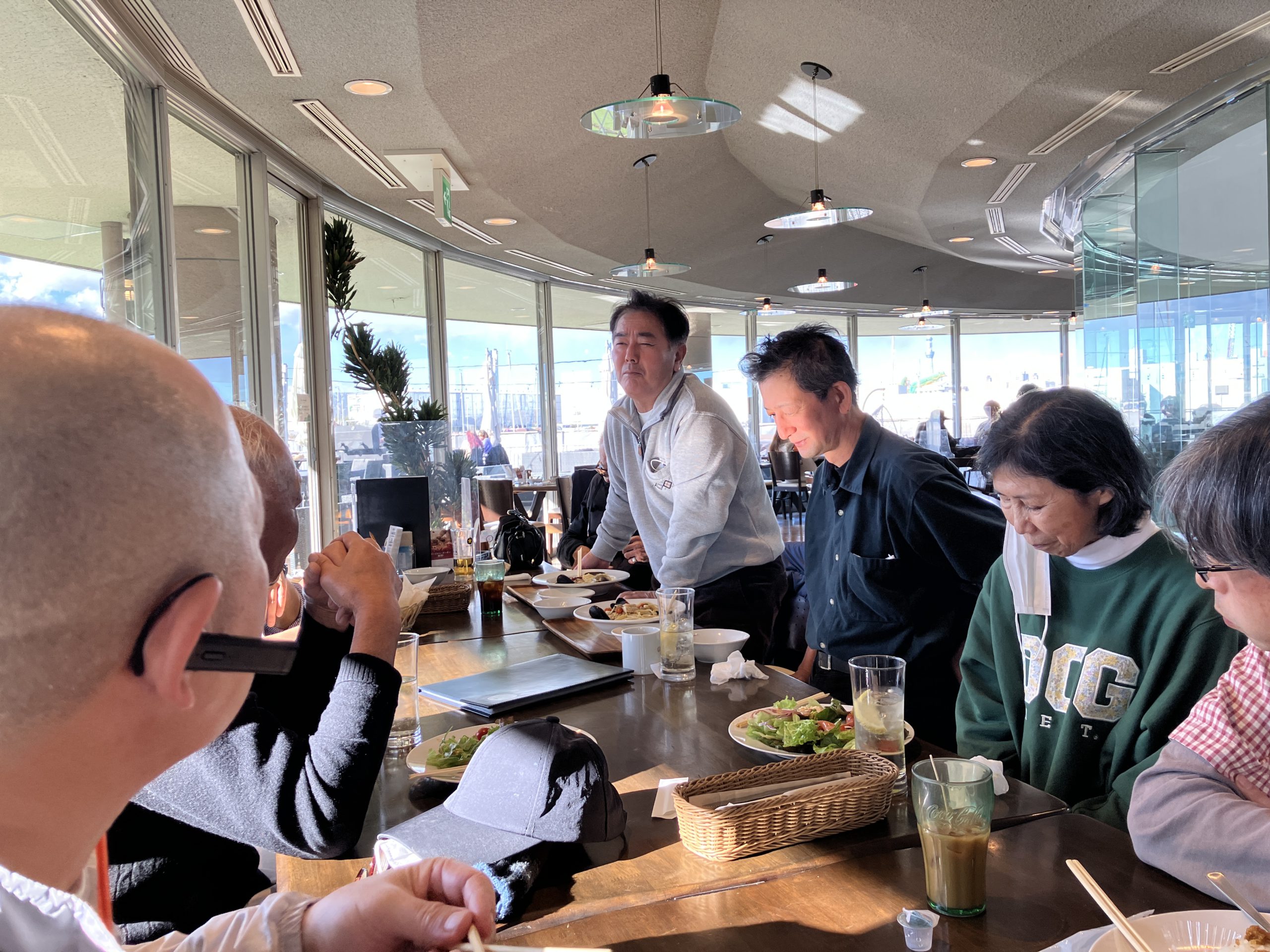 谷下田さん、竹内さん、殿垣内の3人で、とりあえずレストランに移動して皆を待つ。ヒラメに大満足の皆もレストランに来て納会。