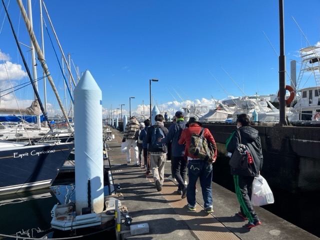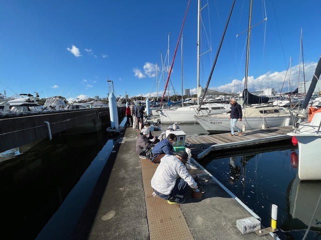 残ったメンバーで片付けや修理などをして、なんとか12時前に終了し、ヒラメをいただきに、竹内さん、そえださん、殿垣内で大型のヨットが係留されているバースへ移動。まさかの小柴さん帰宅。納会にでてくださると思っていたのに、「出るとは書いていない。総括すると書いただけ。」と言われ、やられたと思った。橋本さんは元々ご帰宅のご予定だったので、引き留めない(笑)。残念。お二人には、納会にきていただきたかった。でも、新年会もたぶんありますよ。