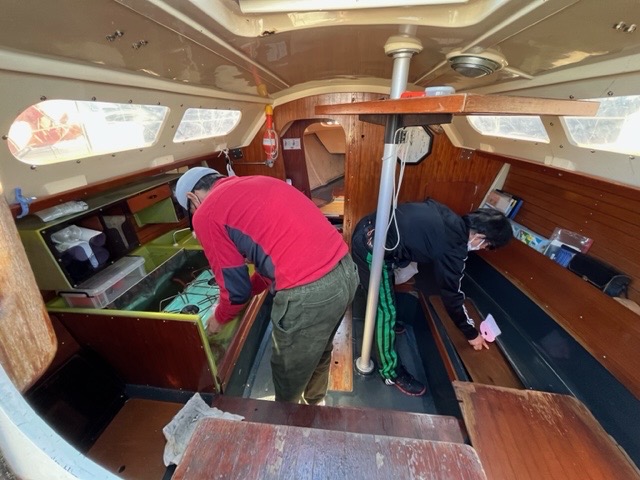 パズルのような様々な大きさや形のマットレスを叩いて干して、ライジャケやロープ類も干し、あらゆる荷物を外に運び出してキャビンを掃除。賞味期限の切れた大袋のおつまみがでてきて、これは小柴さんが持ち帰ったが、健康被害にあわれていないことを祈る。