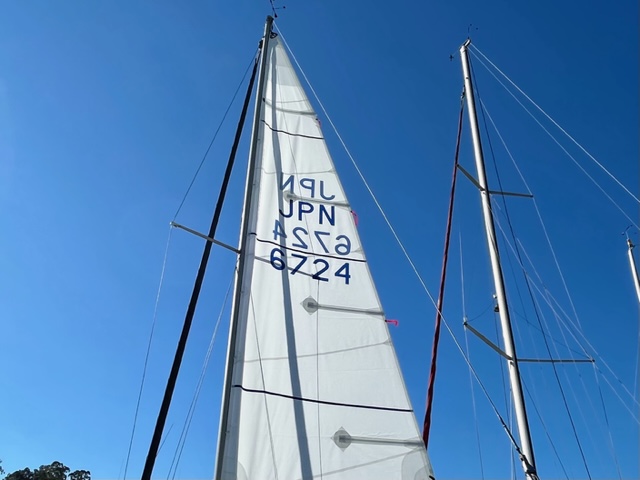 風が弱かったため、係留したままセールをあげてセットアップ。あほうどりは、JSAFに外洋艇として登録しているため、実は「JPN6724」というセールナンバーを持っている。新しいセールにはこれがプリントされていて、レース艇みたいだと皆喜ぶ。
