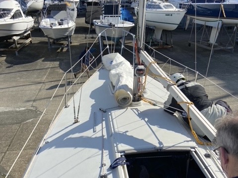 10:10 集合、艤装、出航前打ち合わせ、法定書類等の場所確認、アランさんエンジンオイルチェックし規定量より少なかったためマリーナに依頼し継ぎ足してもらう。