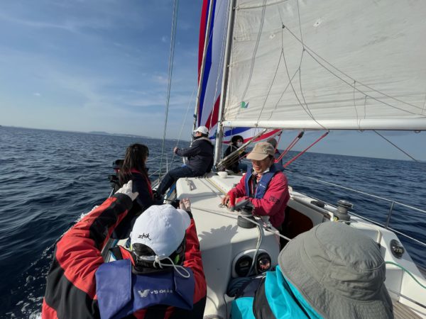 12:45 風弱くセーリングしながら交代で手短に昼食、飯塚さんジブトリマー初体験