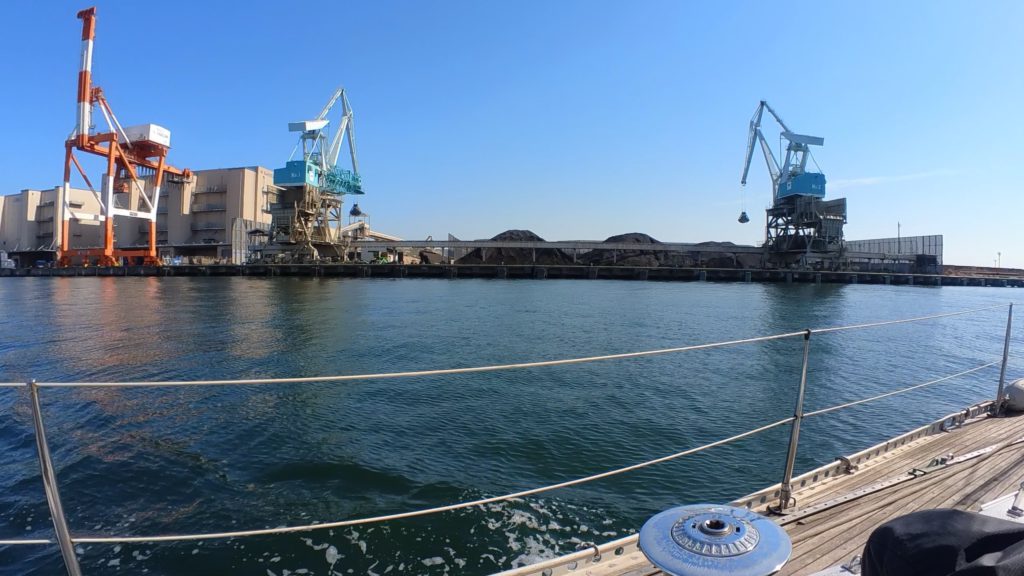 その後、風が急になくなりジブセールを降ろし永井さんから「海から東京観光しましょうか」とのご提案でエンジンをかけ、機帆走にて東京湾をめぐることになりました。副田さんが操作を。気が付くとあほうどりでは行けなかった東京湾東航路から西航路まで進むことができました。途中、貨物船にクレーンからの積み荷の場面や羽田空港滑走路近くまで迫力の連続でした。
