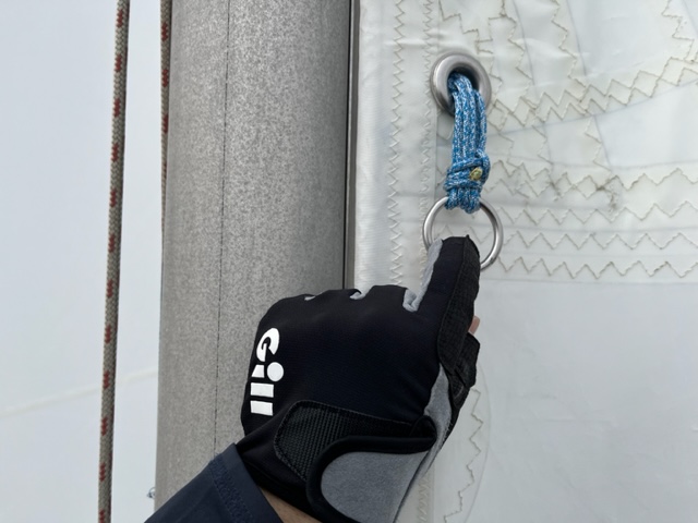 ・新しいセールのマスト側リーフの穴がブームのフックの位置と合わない問題についてリングとロープで荒天時でも簡単にかけられる装具を作成