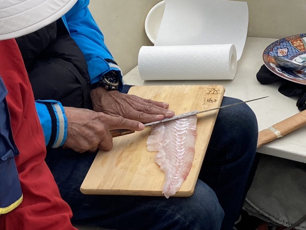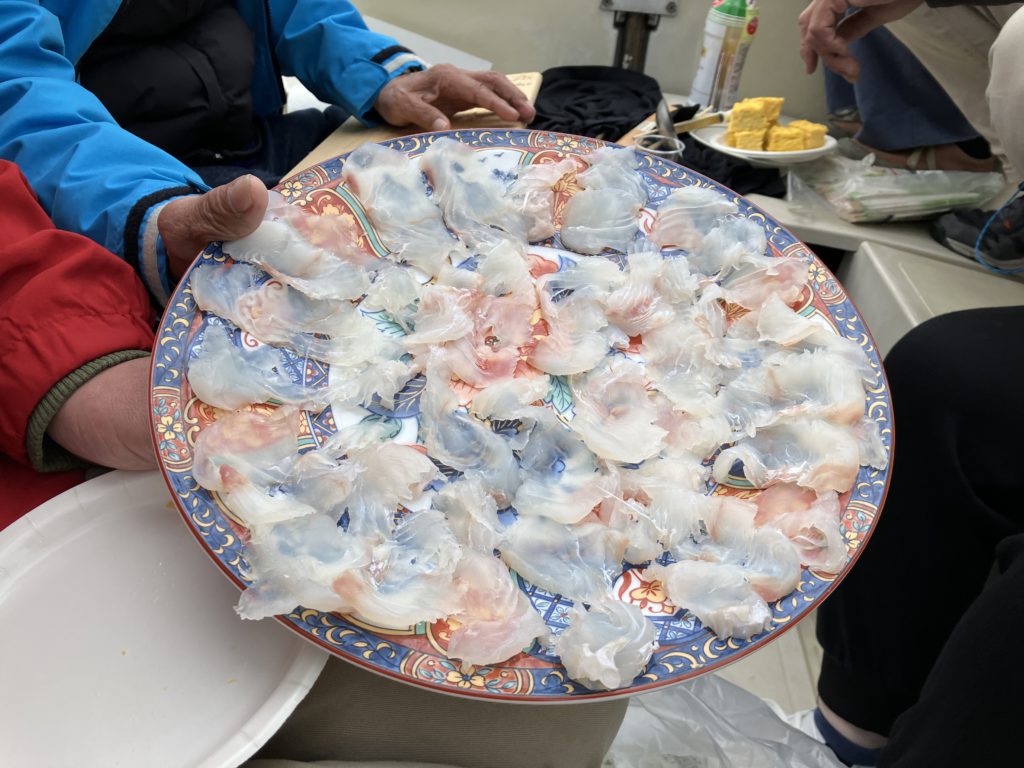 マリーナに戻りあほうどりの上で昨日釣りあげたというヒラメをさばいていただき、刺身、昆布締め、あら汁、お寿司屋ででてくるような卵焼きを食べ、おいしいワインを飲みながら宴。