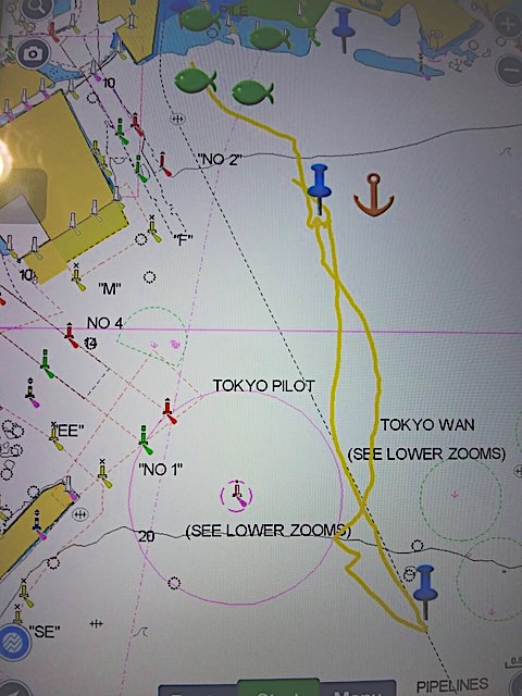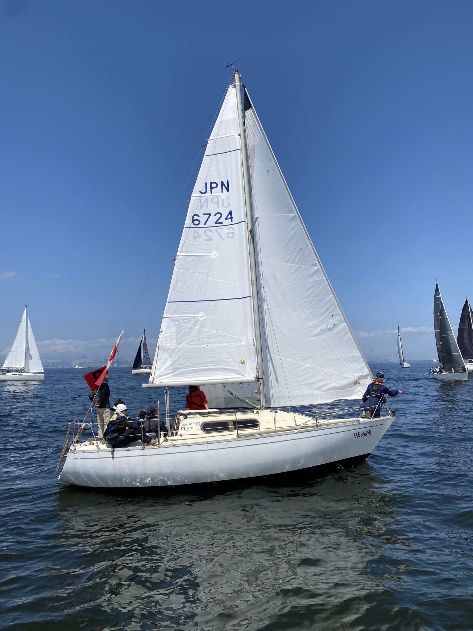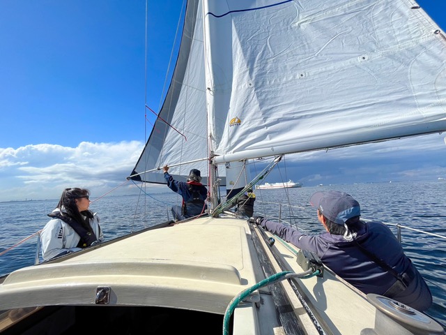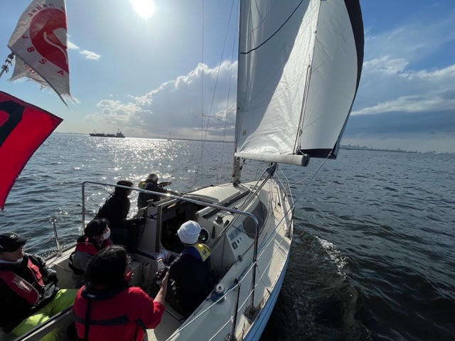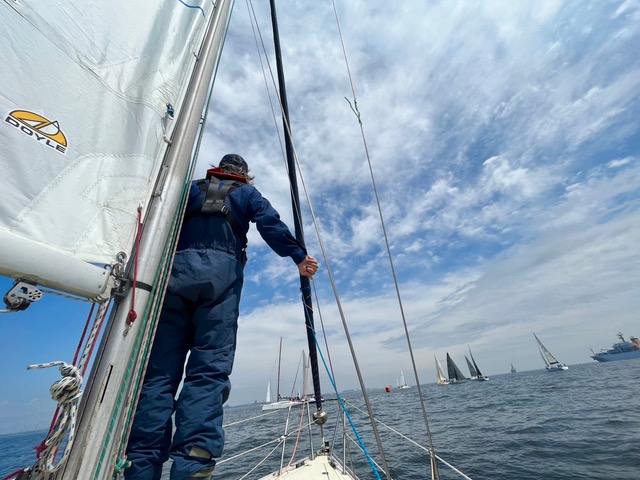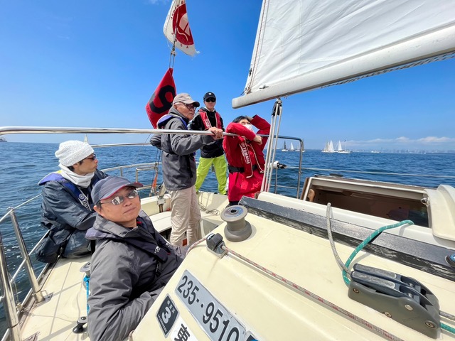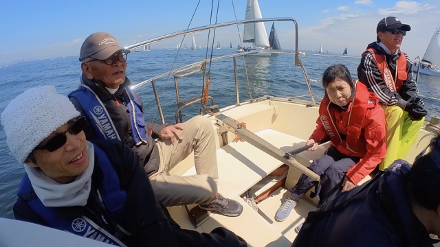 順調な走り出しでしたが失速。風がほとんどありません。それでも方位170度を目指し、上マークを探します。 あらゆる風を味方に、あほうどりは進みました。ベテラン児玉さんと永井さんの連携が驚異の速さを作りだしています。風を読む(ブロー)と風の予測ともう完璧です。永井さんの計算で2時間半後に上マーク 到着の予定。いち早くコースどりと風を読み順調に進んでいったのです。私そのものは後ろから接近してくる船、左舷から接近してくる船、めちゃくちゃ近づいて波を切る音も喋り声も聞こえるほどです。スリリングな経験、初めてで楽しんでいます。