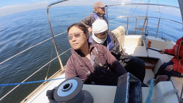 船は順調だったのですが、とにかく風が吹かず前に進みません。周りでは途中レースを諦めて迂回する船もふえてきました。もちろん、あほうどりは諦めずに必死で風の通り道ブローを児玉さん、永井さんが探してくださいました。依然としてタックの数は少なく、ティラーの小倉さんは細い操作でもう2時間以上続いています。小倉さんは「大丈夫。頑張ります。」と明るい笑顔で 答えてくださいました。……