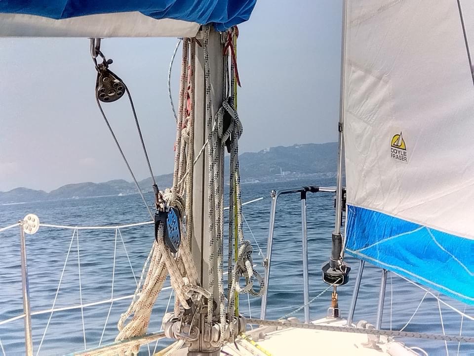 本日は今シーズン初の「ASUKA」でのセイリングを行いました。初夏の爽やかな陽ざしのもと、出航すると、マリーナを出る手前で、スナメリと遭遇。クルージングへの期待がぐんと高まる。微風で海面はとても穏やか。池谷さんの指示で、山田(剛司)さんと森崎がティラーを操作しました。