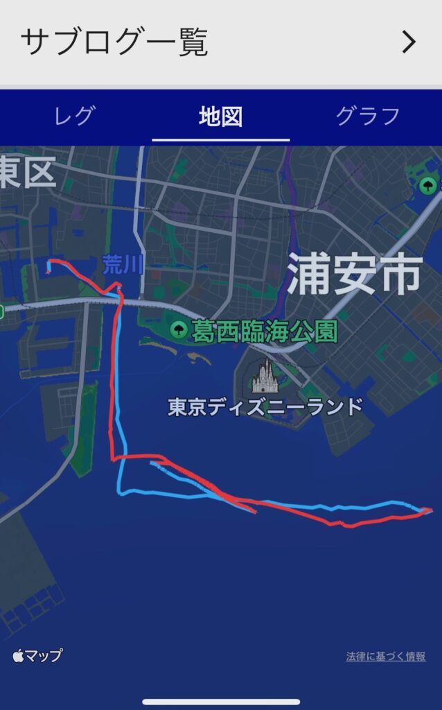 荒川の河口を下り、京葉線の鉄橋を超えて若洲沖に至るまで南西の真向かい風が入る。途中、殿垣内さんが風速を計測していて、10メートルにも達したりする。